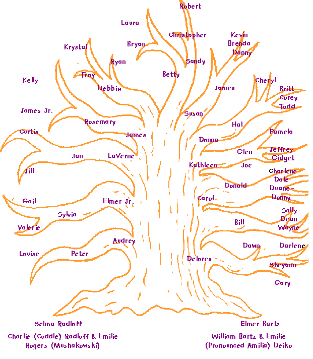 Here is our family tree. The roots and branches are all there, but we need your help to fill in the little branches and leaves (spouses and children).